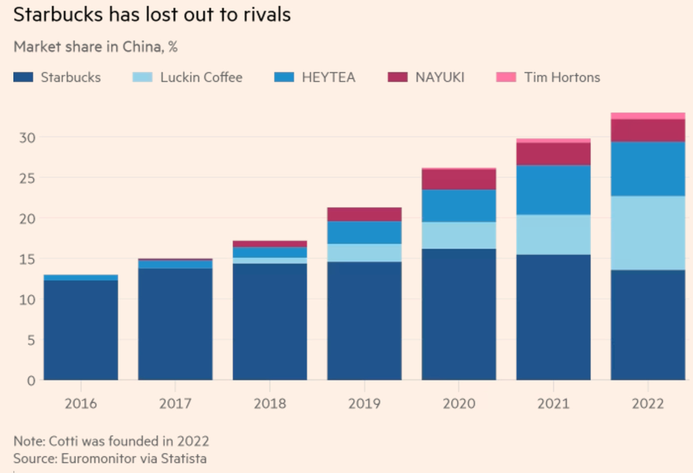 1/ Starbucks' struggles in China show the critical importance of local adaptation in highly competitive and culturally distinct markets. Despite a strong presence, the company has been outperformed by domestic competitors like Luckin Coffee and Cotti, which have leveraged automation, cost-efficiency, and local consumer preferences to achieve remarkable growth. This highlights the need for global brands to align their offerings and operational strategies with the specific demands of local markets rather than relying solely on global brand recognition.