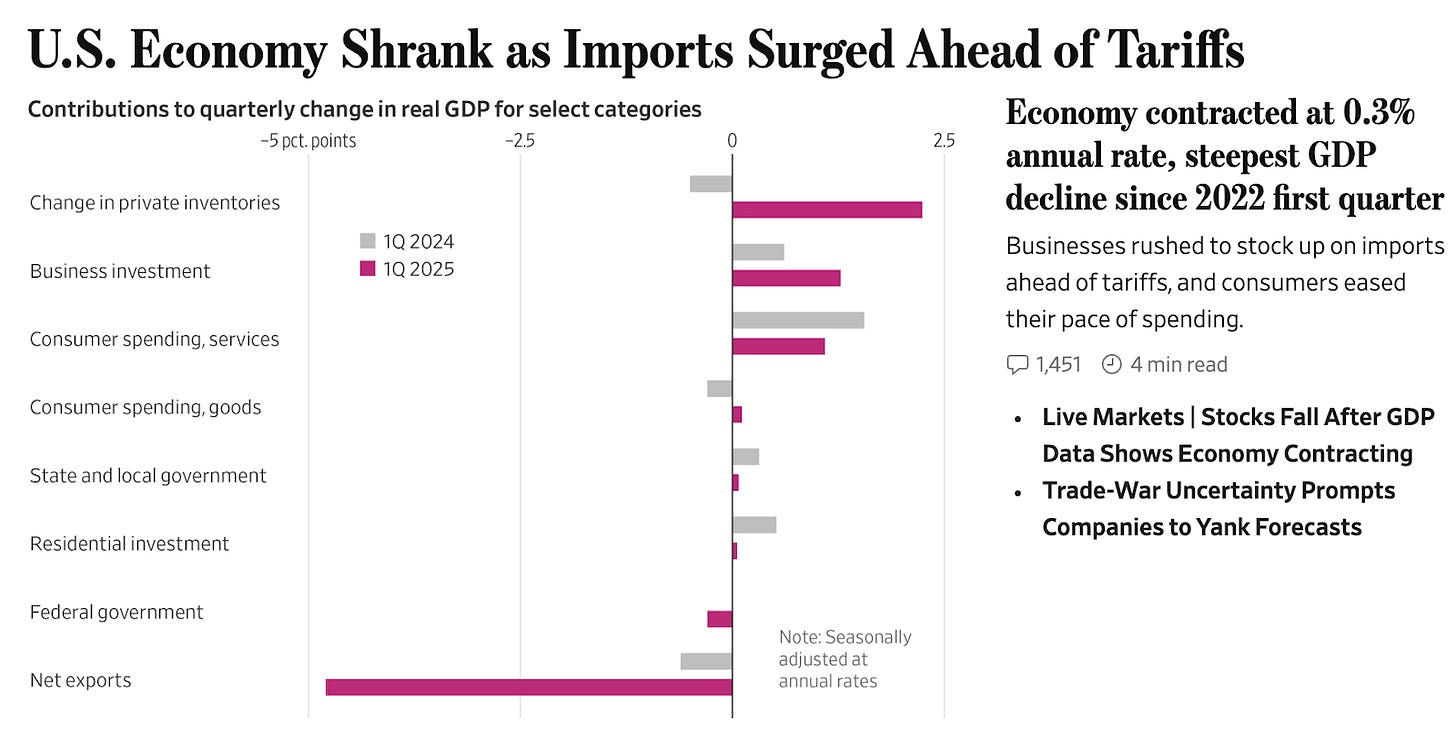 1/ What weâre seeing is the beginning of a classic policy-induced dislocation. The economy contracted by 0.3% in Q1 2025 not because demand collapsed, but because tariffs distorted behavior. Firms front-loaded imports before the new levies kicked in, resulting in a 41% spike in inbound goods. That surge subtracted nearly 5 percentage points from GDP, making it look like the economy shrank, even though underlying demand (consumer spending, private investment) was healthy. Itâs a reminder of how the levers of macro policy (like tariffs) operate with lagged and nonlinear effects. In short: move one piece, the system reacts somewhere else.