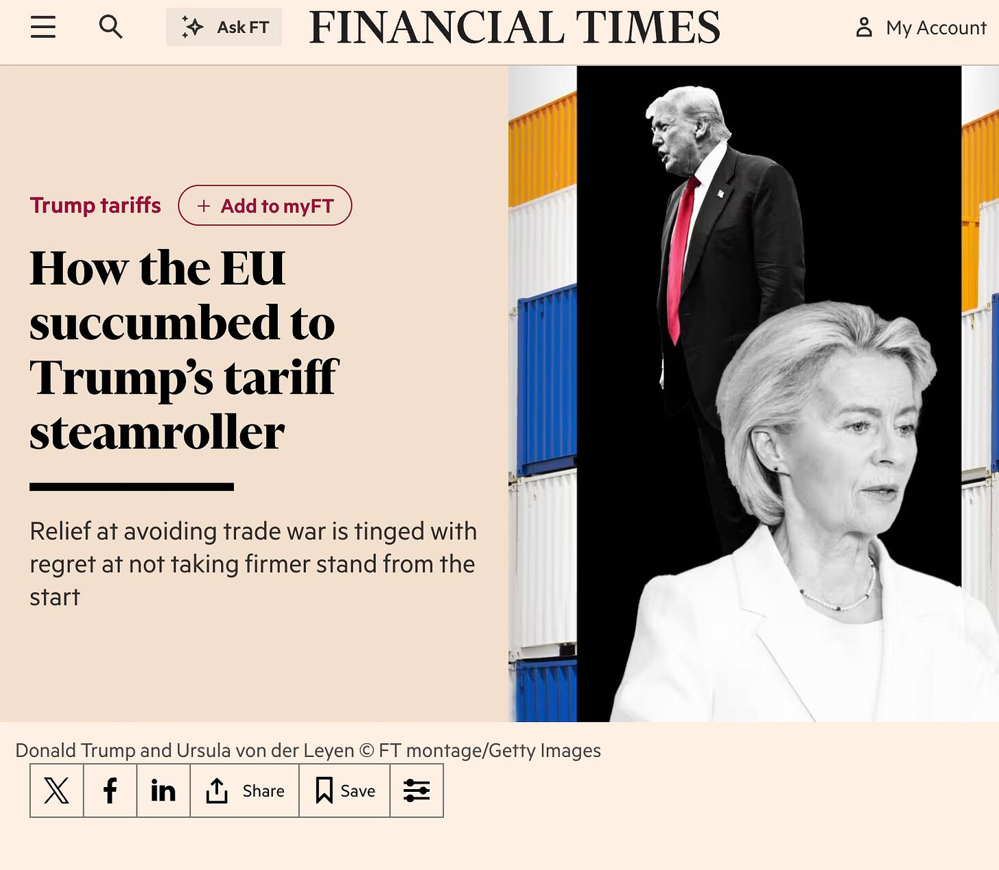 The deal? A baseline 15% tariff on EU goods vs. 0% for the US goods, plus a $750 billion for buying American energy and investing $600 billion in the U.S. economy. In other words: please don’t hurt our car exports.