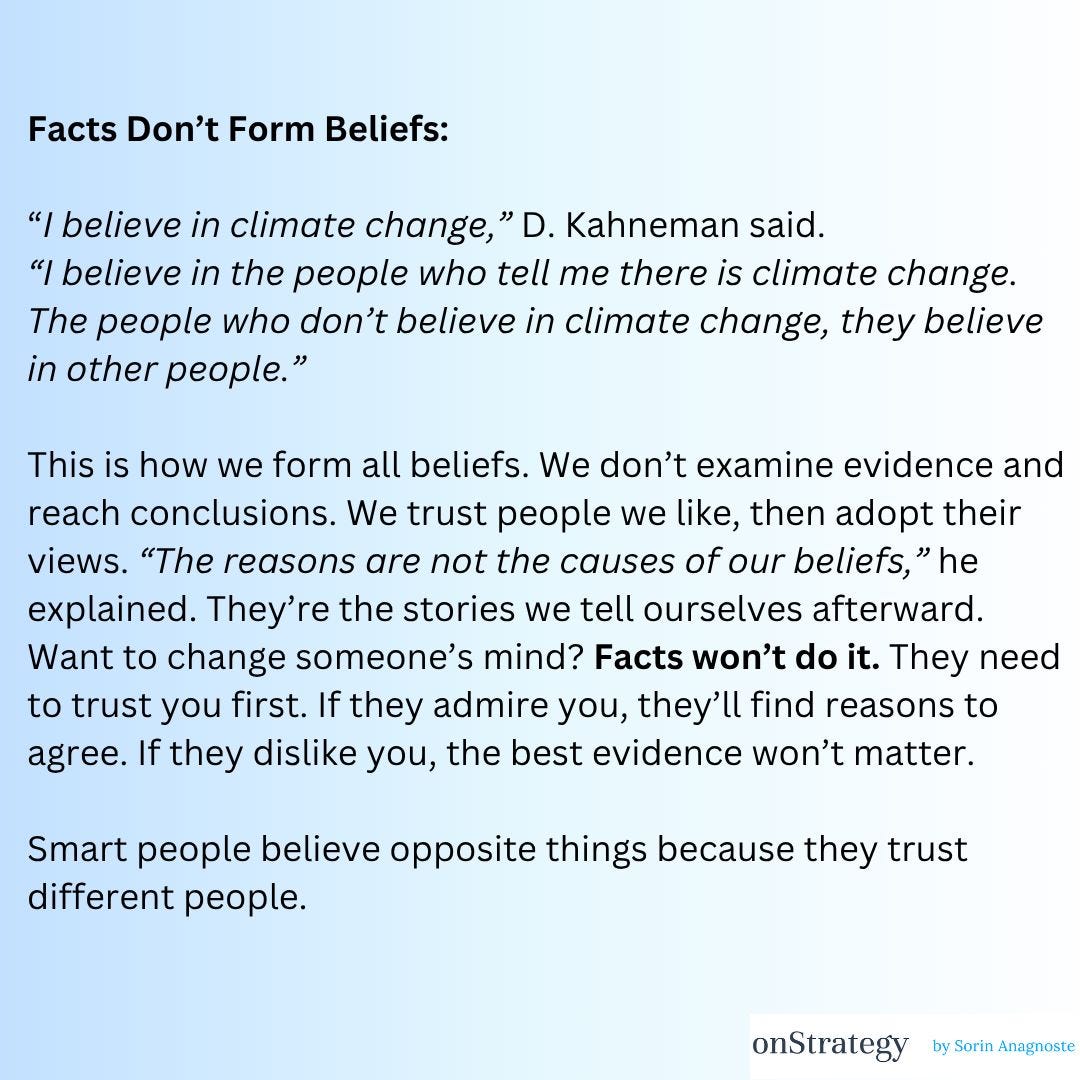 The stories we tell ourselves (about our team, our tribe, our heroes) are the scaffolding of our reasoning. So next time you present a 42-slide deck hoping to “change minds,” just remember: if they don’t like your shoes or your haircut, you’re already losing the argument 😉