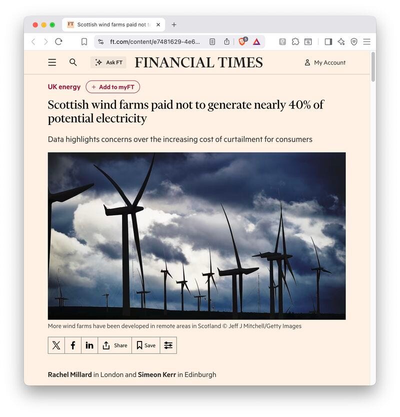 🏴 Scotland just pulled off the renewable energy equivalent of hiring Lionel Messi and paying him to sit on the bench. Nearly 40% of potential wind output was shut off in the first half of the year, not because the turbines were broken, but because there’s no way to get the electricity to where it’s needed (!!)