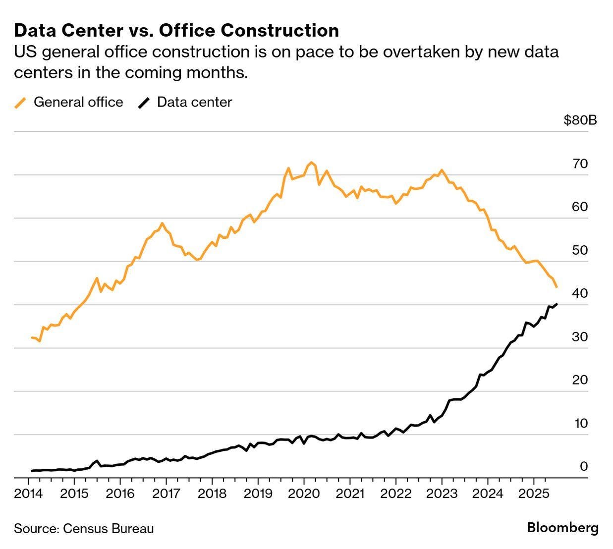 Offices were where people talked about doing things; data centers are where machines actually do them. AI training doesn’t need a 401(k) or ergonomic chairs ... it needs megawatts and fiber lines. So yes, this is the end of the "office as the cathedral of work" era. The new cathedral hums at 65 decibels, smells faintly of ozone, and its only employees are there to make sure the blinking lights keep blinking. LINK