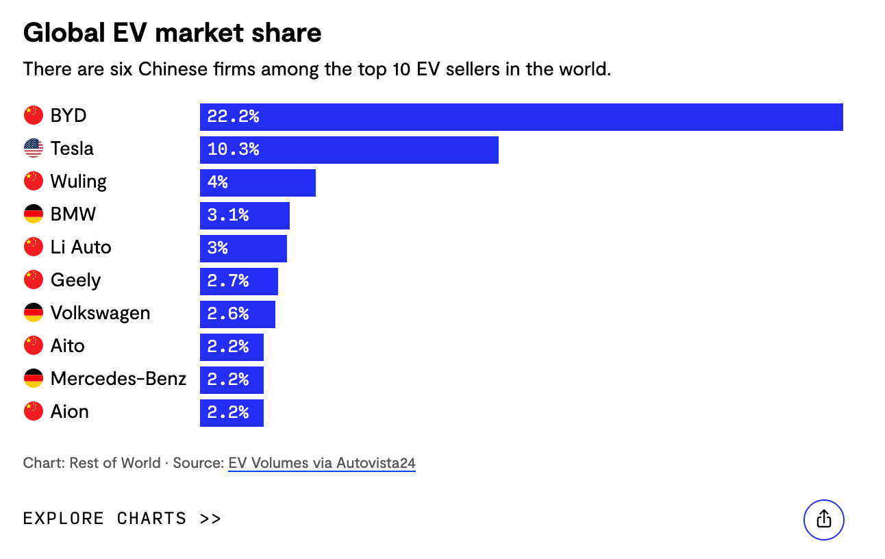 Six of the world’s top 10 EV sellers are Chinese and they’re not just dumping cars in ports. More than that, they’re setting up factories, R&D centers, and service networks in Brazil, Thailand, Hungary, you name it. It’s vertical integration plus localization, wrapped in a cost structure Western automakers can’t touch. And because their product cycles are 18 months versus the West’s four years, they’re basically iterating cars the way Silicon Valley iterates apps.