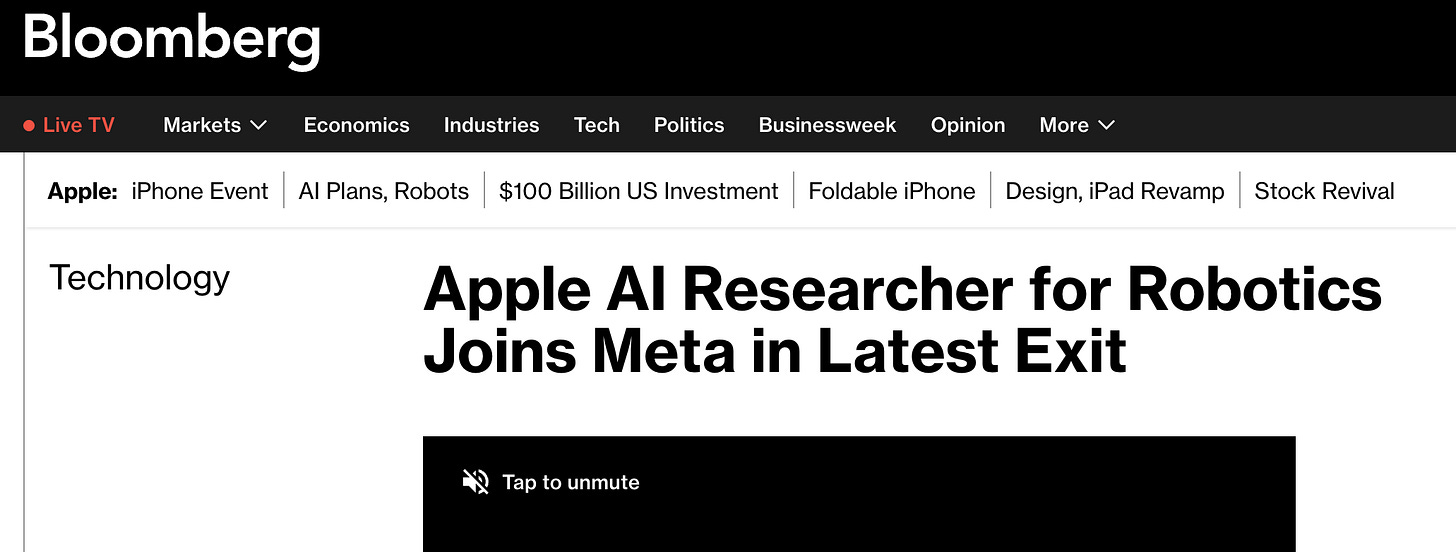 Apple, once the fortress of talent retention, is now watching its crown jewels leave for companies that are actually building the future Apple wants to sell. Meta gets the robotics team, OpenAI gets the LLM brainpower, Anthropic gets the scraps, and Apple gets… a share price dip and another round of “what’s next for Siri?” stories. It’s not that Apple doesn’t care about AI, but it’s that its best researchers don’t think it can win. And when your employees believe the competition has a better shot at your own vision, that’s not just brain drain. That’s strategy drain. LINK