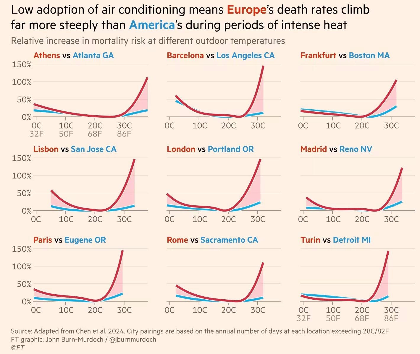 The thing is, this is entirely preventable. Once indoor temperatures climb past 30°C, mortality spikes. Yet the EU’s regulatory reflex is to make AC harder, not easier.... “oat drink” logic applied to cooling. If Europe had treated AC the way it treated renewable subsidies, you’d have subsidies for heat pumps, incentives for efficient retrofits, and grids scaled to handle summer loads. Instead, you get a "don’t worry, just open a window" energy policy.