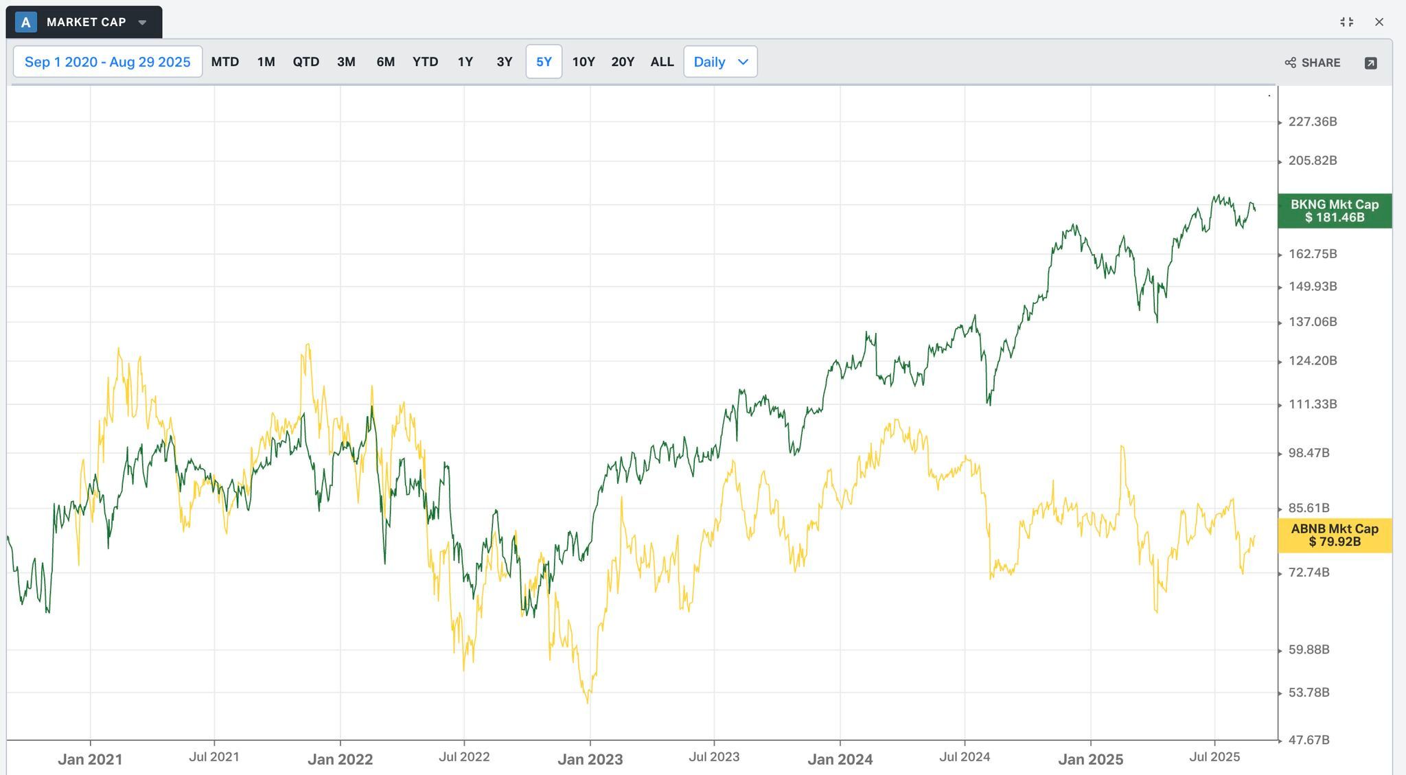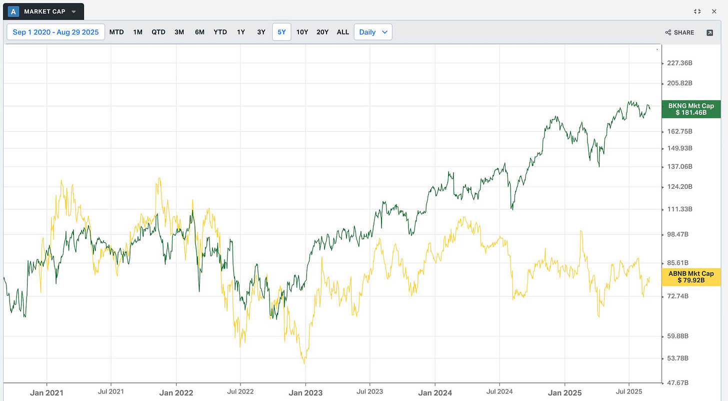 Meanwhile, Booking Holdings is worth more than double Airbnb, because boring is beautiful. Booking sells inventory that scales (e.g., hotels, flights, packages) without pretending it’s going to reinvent haircuts. Airbnb, by contrast, keeps trying to prove it’s a lifestyle brand when what investors actually want is consistent margins. If disruption turns into a punchline, Booking becomes the annuity and Airbnb becomes the meme stock of travel.