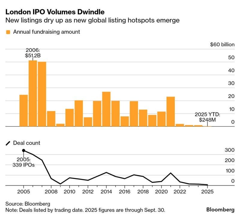 The London IPO volumes have collapsed from a champagne-popping $51.2 billion in 2006 to a modest $248 million year-to-date in 2025, which is less a âglobal financial centerâ and more a âregional fintech meetup with a former empire buffet.â