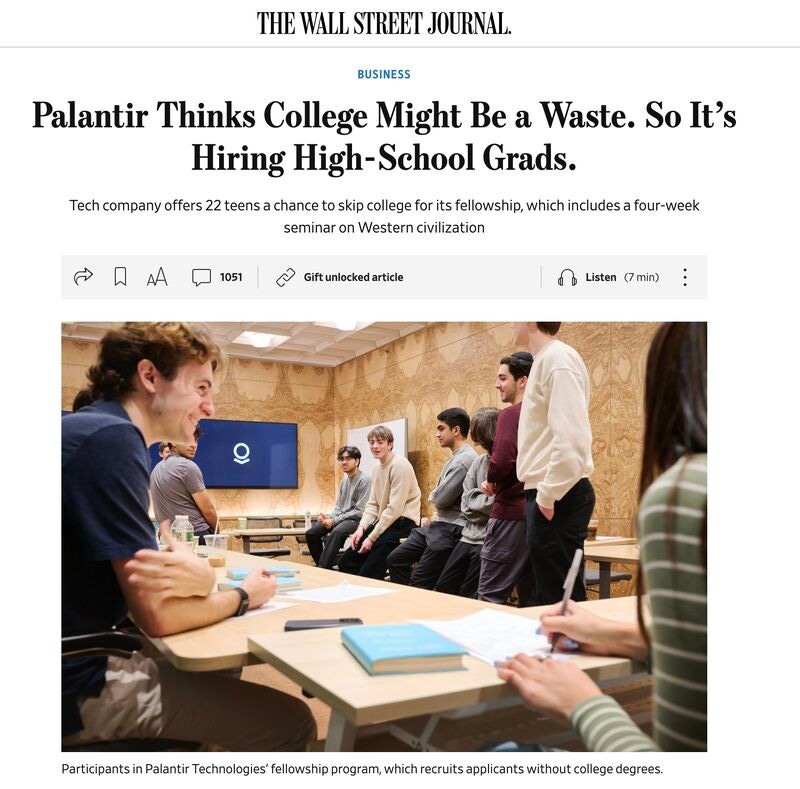 And itâs working, not because itâs utopian or even scalable.... yet, but because itâs a rational response to a broken trust. If elite universities no longer guarantee elite talent, companies will build their own Ivy League replacements. That means fellowships instead of freshman year, seminars on the West (and classics!) instead of DEI workshops, and live product teams instead of mock case competitions. This is the beginning of a parallel educational-industrial complex, one where the filter is competence, not credentials. And as more CEOs realize that traditional academia is turning out brand liabilities, not assets, expect this model to go from edge-case to blueprint. Universities were supposed to be the gatekeepers of excellence. Now theyâre the reason companies are building new gates. WSJ