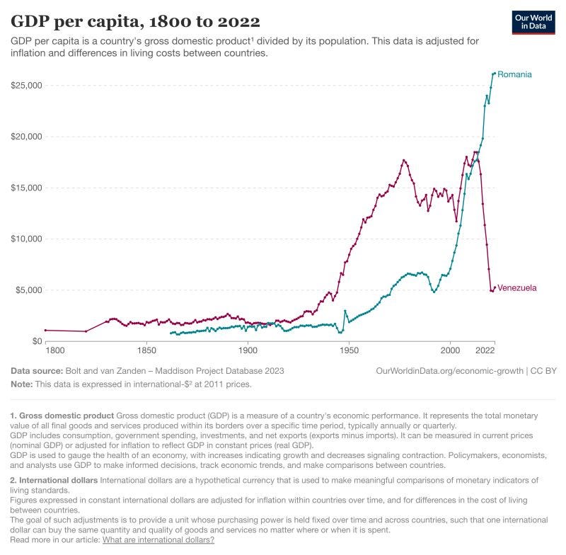 On the other hand, Socialism treats information as a memo and entrepreneurs as a problem; it fixes prices, then wonders why goods disappear and people follow. The result is visible in the spread, where one line is volatility with upside (policy beta that pays), the other is a controlled descent: first the currency, then the capital stock, then living standards.