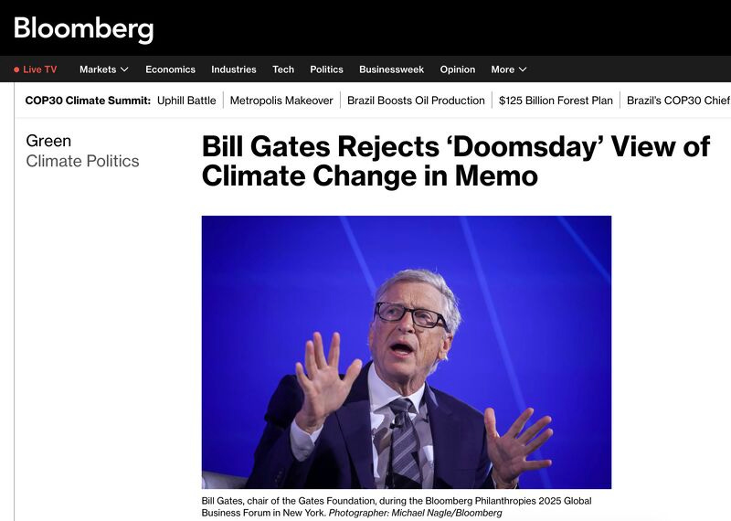 Itâs not that his arguments are entirely wrong... yes, tradeoffs matter. But the sudden rebranding of climate urgency into something that sounds like a TED Talk sponsored by Dow Chemical is peak Gates. Itâs the same tone shift we get when Hollywood celebrities stop screaming about a cause once the checks stop clearing. When the guy who once said innovation would solve everything decides that adaptation is now the story that means heâs quietly conceding the tech didnât scale, the economics didnât work, and the politics got too messy, so now itâs time to move the goalposts and act like that was the strategy all along. Bloomberg, Bill Gates