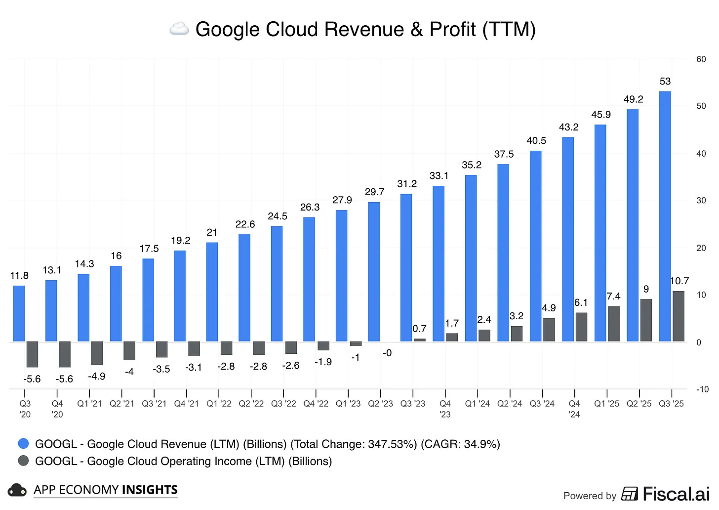 Googleâs quarter was the corporate equivalent of quiet luxury, which is, no drama, just record-breaking numbers delivered with terrifying efficiency. They delivered $102.3 billion in revenue (+16%; first time for a quarter to surpass $100bn), $35 billion in net income (+33%), and the most underhyped CapEx explosion on Wall Street this year. CaPex jumped from $52.5B to over $90B, almost entirely to feed the AI beast. Unlike Meta, which has to beg investors to believe in its AI moonshots, Google is just shoveling compute into data centers and watching actual margins go up. The cloud (GCP) grew 34% YoY, but also hit a 24% margin, which is wild when you remember this business was a money pit just 10 quarters ago. This is what it looks like when a company transitions from âsearch giantâ to âinfrastructure hegemonâ without ever pausing for breath.