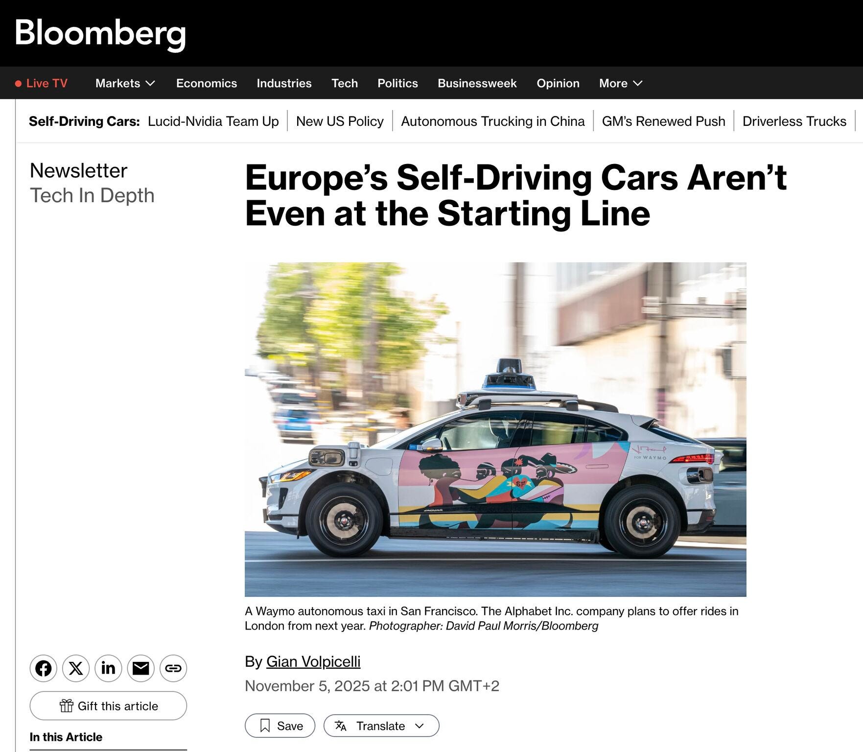You know things are bad when startup founders in the US start saying, with a straight face, “This company wouldn’t exist if we had started in Europe” [1] ---> not as humblebrag, but as a completely accurate economic diagnosis. Europe totally lost the plot on self-driving cars because it regulates like a nervous librarian, funds like a slow-motion bake sale, and then holds panels on why it’s falling behind. While San Francisco has Waymo and Cruise dueling for robo-taxi supremacy (and China has many more starting with Pony AI), Europe’s most promising autonomous vehicle deployment is still in “development” and probably delayed because Brussels needs three more committees to harmonize parking lot signage.