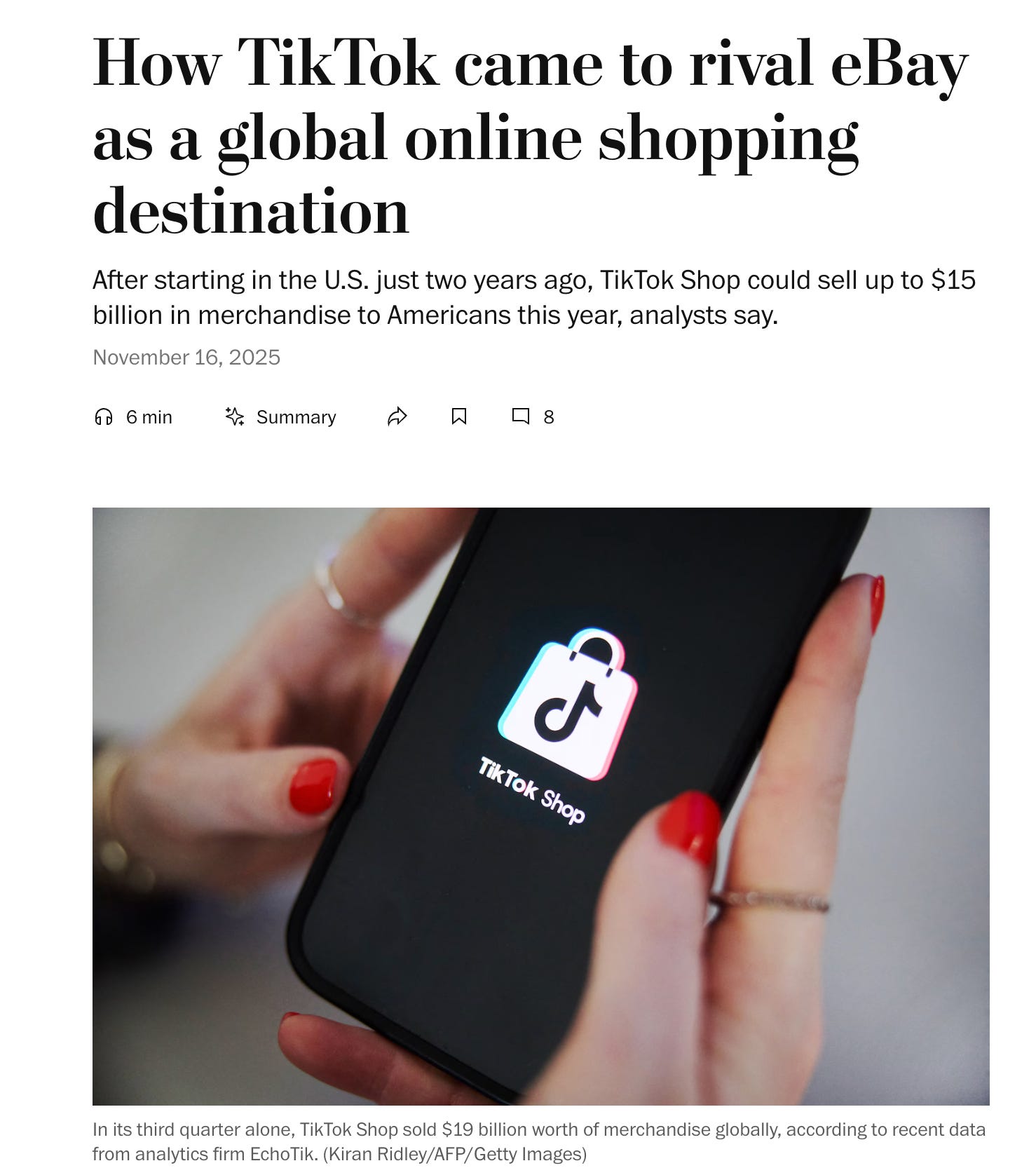 The strategy works especially well for unbranded products and spontaneous purchases. TikTok Shop does not require strong brand identity to achieve high conversion. It relies on price appeal, creator influence, and the speed of content-driven trends. Consumers are influenced by trust in creators and the immediacy of the feed. eBay focuses on intent and listings. TikTok focuses on discovery and engagement. The model represents a shift in how younger generations interact with commerce. Videos, creators, and short-form narratives guide purchase decisions. This is a framework for the next generation of marketplaces, shaped by attention and content flow rather than catalog and search. WaPo