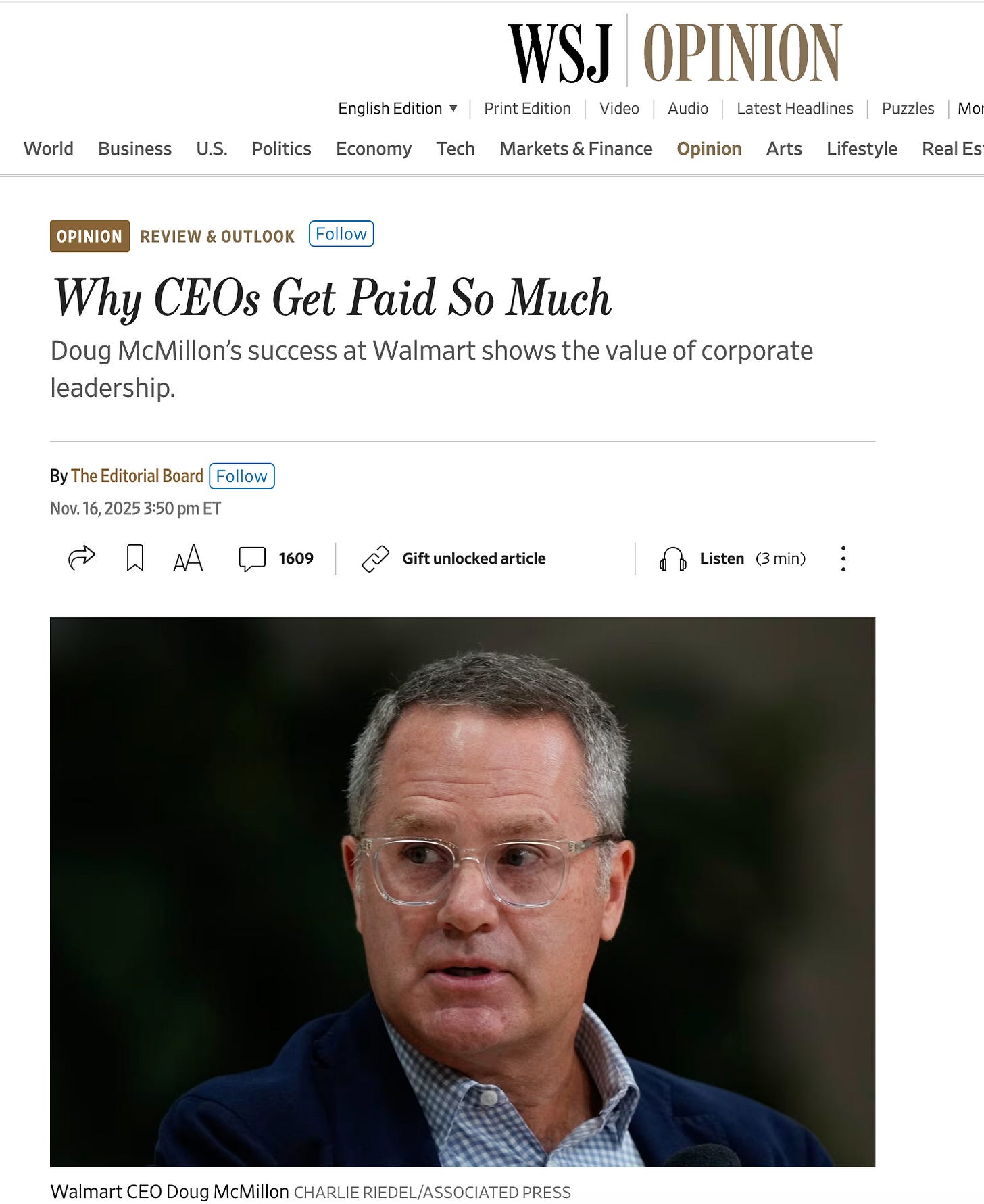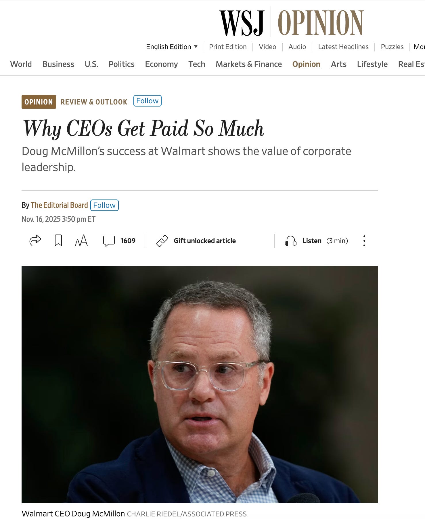 The role of a modern CEO resembles a hedge fund manager crossed with a data scientist and layered with diplomatic instincts. McMillon pulled it off with a Midwestern accent and no viral podcast clips. Government budgets drift, infrastructure crumbles, and congressional hearings go viral for the wrong reasons. Meanwhile, Walmart continued to sell dish soap in 10,000 zip codes and quietly build one of the largest AI footprints in retail. Comparing McMillon’s compensation to the average wage does not tell the full story. Comparing it to the output he managed across decades offers a cleaner framework: shareholders, employees, and vendors all made money while the company avoided collapsing under its own scale. That sounds like a pretty good trade. WSJ