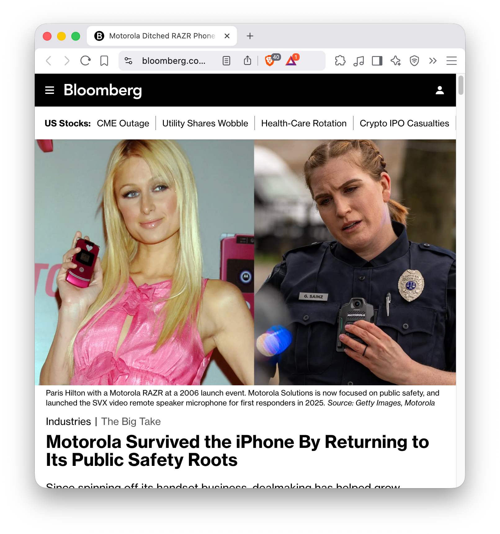 Motorola focused on the one market where latency, reliability, and security matter more than user experience: public safety. While Europe was busy trying to regulate every byte of AI, Motorola was building “AI nutrition labels” for its products, launching battlefield mesh networks, and signing billion-dollar deals with global police and military. It’s a playbook that regulators in Brussels wouldn’t understand, because they don’t build anything anymore. Motorola’s resurgence shows the power of strategic clarity: pick a customer (in this case, governments), become mission-critical, and expand horizontally with M&A only when it tightens the bundle. Greg Brown out-executed everyone in a niche market that suddenly became geopolitically sexy…again. Bravo! Bloomberg