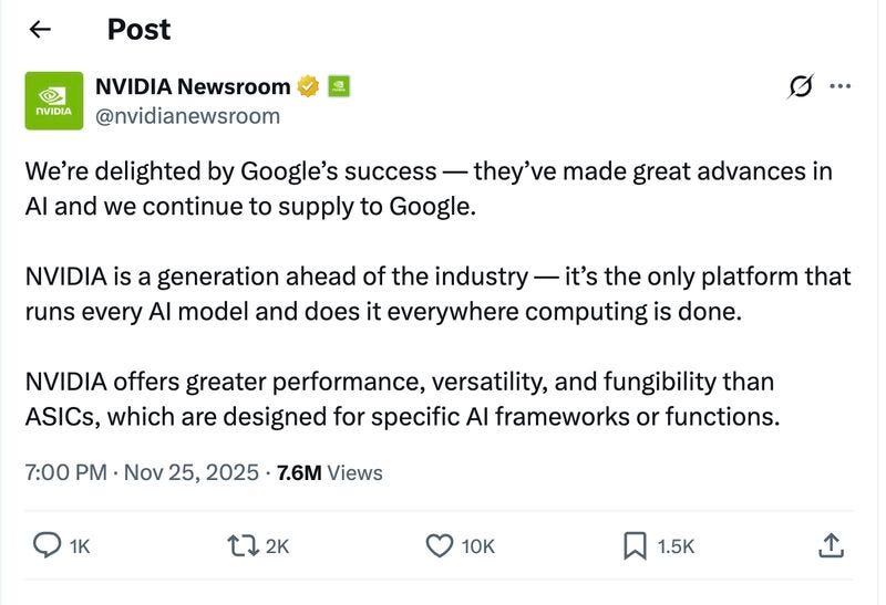 Google just showed off its fancy new AI chips, and NVIDIA, instead of going defensive, issued a warm note of admiration, followed by a very subtle flex: “We’re a generation ahead. Our stuff runs every model. On every machine. And by the way, unlike those charming little ASICs of yours, ours work everywhere and do everything.” This is corporate diplomacy mixed with humblebrag energy levels typically reserved for Olympic gold medalists congratulating silver medalists.