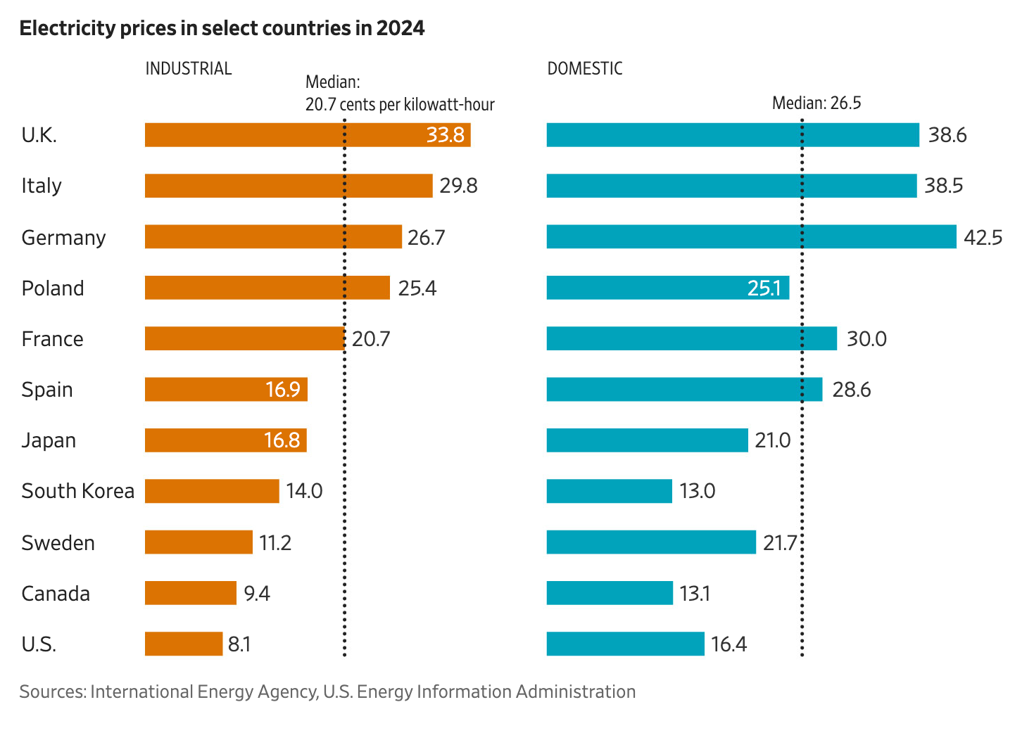 The grand European green transition was sold as a “win-win”: save the planet and boost the economy. In reality, Europe traded energy abundance for ideological purity and ended up with the highest electricity prices in the developed world and a structurally uncompetitive industrial base. Germany’s domestic electricity costs hit 42.5 cents/kWh, compared to just 16.4 cents in the US, while industrial rates across the EU remain roughly double those in the States.