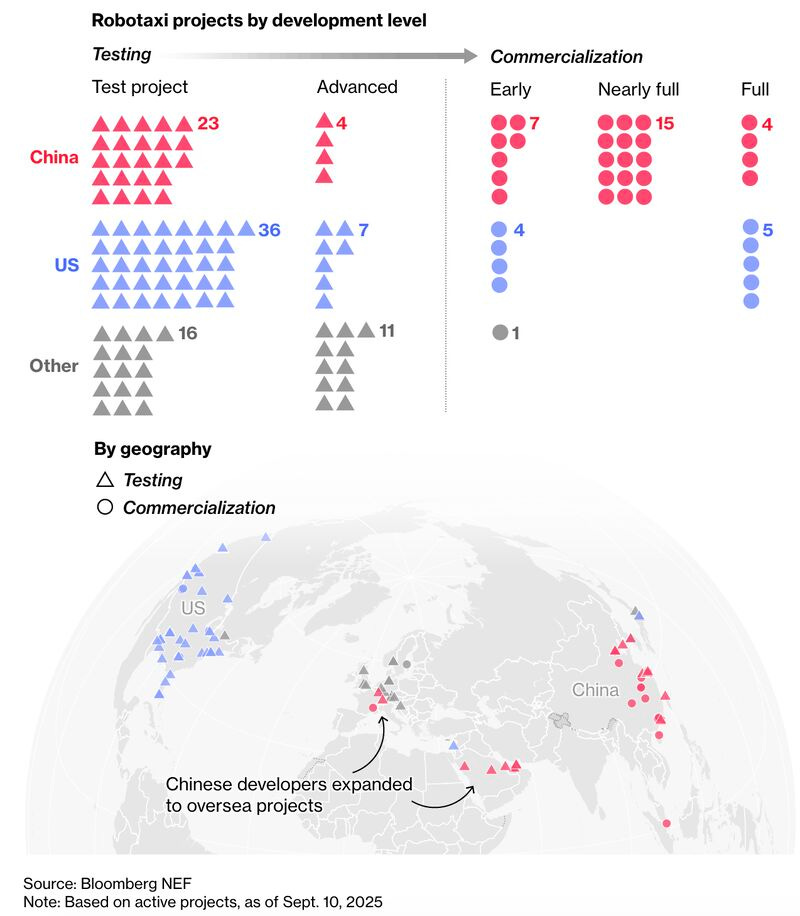 China is overtaking the US by scaling abroad. While Waymo operates robotaxis on a handful of American roads, Chinese companies like Baidu’s Apollo Go, WeRide, and Pony.ai are expanding globally, running real, live services in cities like Dubai and Singapore, and planning deployments in the UK and Germany.