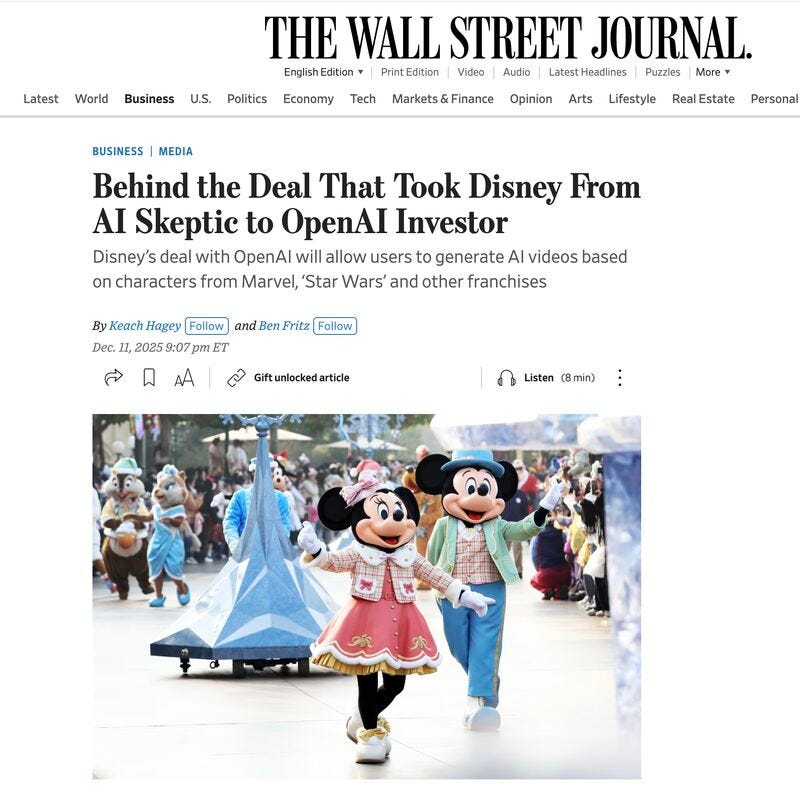 The fact that Disney is investing $1B in OpenAI and getting warrants at a $500B valuation suggests that if content is no longer king, then distribution and modular partnerships are, and OpenAI is proving to be much better at both than the legacy platforms that once thought they could just crawl their way to dominance. WSJ