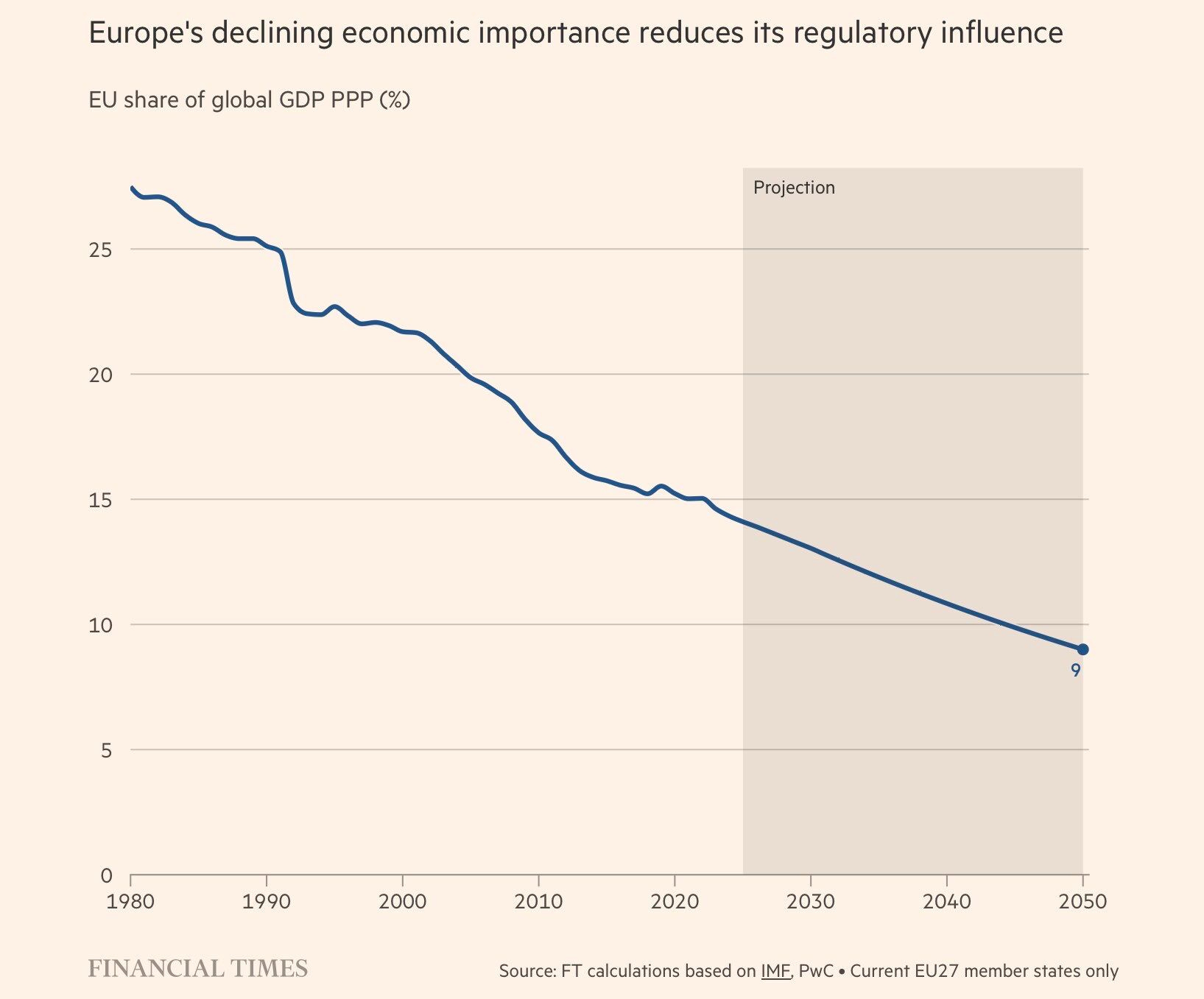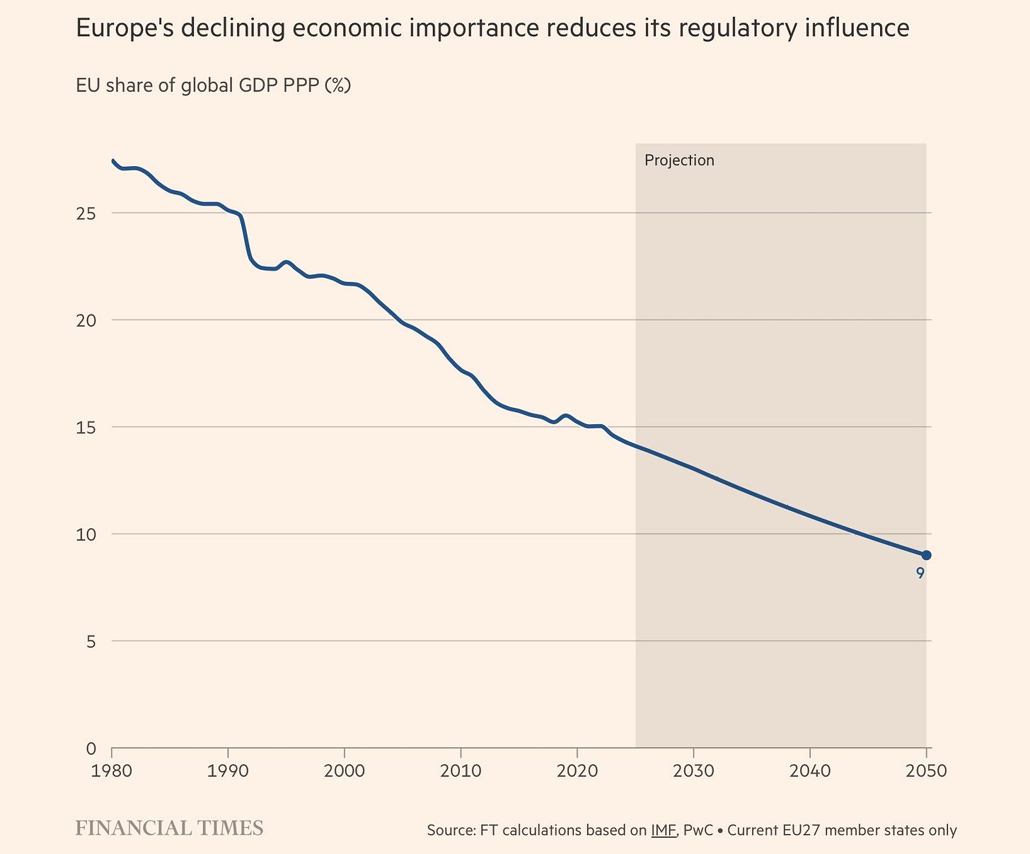 Europe loses because rules are downstream of economic gravity. When your share of global output slides for decades (and the chart is basically a ski slope into the projection zone), you stop being the default market everyone optimizes for, and your “Brussels effect” turns from leverage into paperwork.