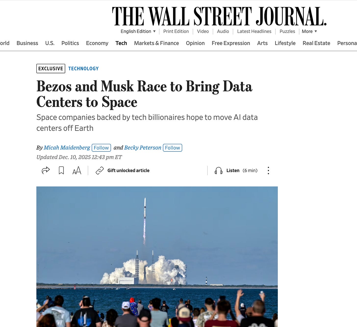 However, there’s another layer here, which is strategic positioning. Musk and Bezos are locking in defensibility. Orbital data centers shift the power balance from hyperscalers like AWS and Google Cloud to platform-native infrastructure firms. SpaceX’s bet is clear: if you can launch satellites at will and power them with sunlight, you don’t need to ask for permission from regulators, landlords, or energy grids. In that context, Starship is a competitive moat. This is not about computing for today; it’s about building the next AWS in orbit, outside the jurisdiction of terrestrial constraints. WSJ