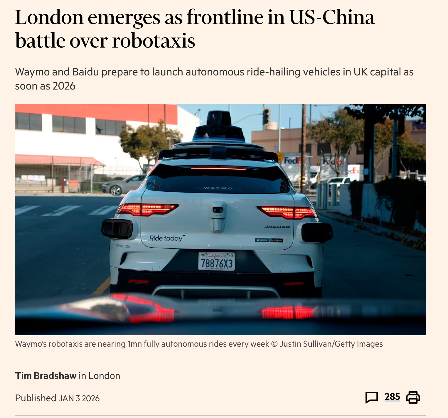 London is attractive not because it’s a car hub, but because it’s a regulatory middle ground between the “Wild West” of Silicon Valley and the surveillance-heavy “Wild East” of Beijing. The US bans Chinese AVs, China doesn’t let US firms in, but Europe still plays nice with everyone. And so, it becomes the stage where this AI cold war gets a steering wheel. Whether the winners master zebra crossings or just data compliance first, the real takeaway is that mobility is being redefined by software infrastructure, not engines or legacy car brands. FT