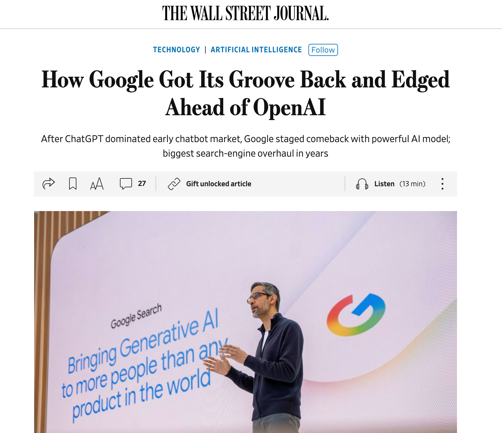 But the deeper lesson is about platform maturity. Gemini’s image generator (Nano Banana), its 650 million monthly users, and its in-house chip advantage (Ironwood) illustrate what happens when an internet-scale company finally applies its full weight to a competitive vector. Google’s slow start let OpenAI define the consumer narrative, but its scale, integration into search, and hardware stack now define the enterprise narrative. The real disruption is that Google is turning AI into a margin-expanding layer atop its dominant platforms, while rivals are still figuring out monetization. This is what “being the platform” looks like. WSJ