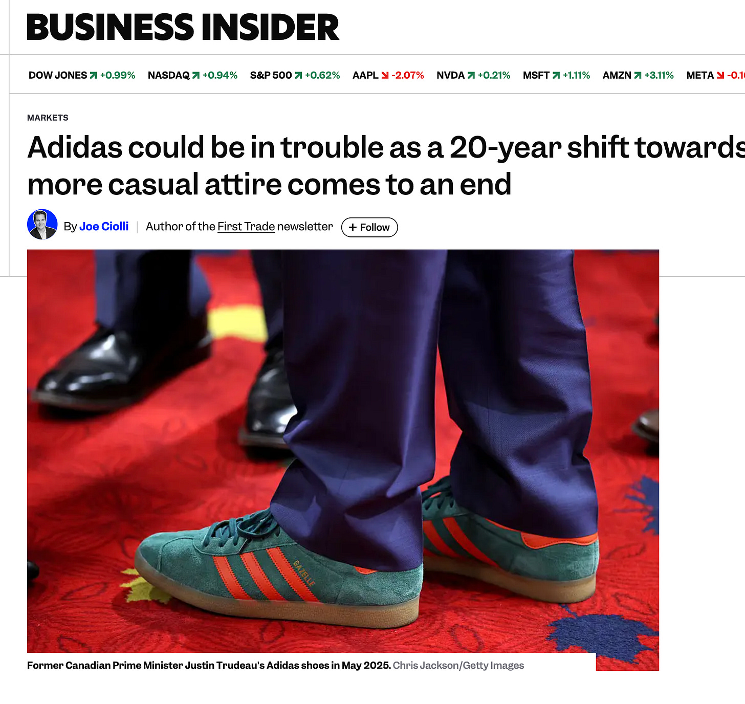 Oh no, sneakers with suits might be over. Bank of America gave Adidas a rare double downgrade, citing the “end of casualization”, a 20-year societal arc where pajama pants left the house, sweatpants got rebranded as “athleisure”, and sneakers snuck into the boardroom. This whole aesthetic shift made Adidas a lot of money, apparently too much, and now that people are allegedly dressing like grown-ups again, it might all unravel. Not because Adidas did something wrong, mind you, but because cultural trends are fickle and you can’t short vibes until someone at BofA decides it’s time to wear a belt again.