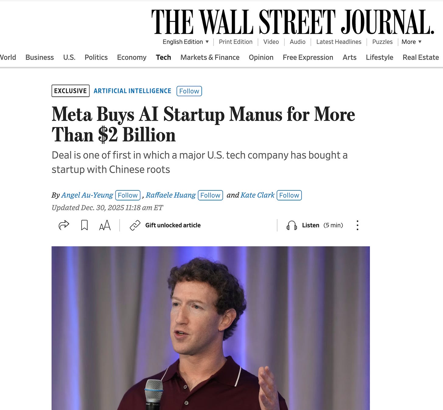 The geopolitical subtext matters too. This is one of the first big US tech acquisitions of a startup with deep Chinese roots (founders, staff, early infrastructure) and it shows how American platforms now need to look abroad, not just for users, but for product-market fit. Manus started in Beijing and Wuhan, but pivoted to Singapore to skirt regulatory heat, shut down its China business, and now lives inside Meta’s AI division. This is the “elimination theory” in action: the internet rewards companies that integrate distribution, monetization, and technology into a single stack. Meta needed velocity, users, and a working business. So it bought them. WSJ
