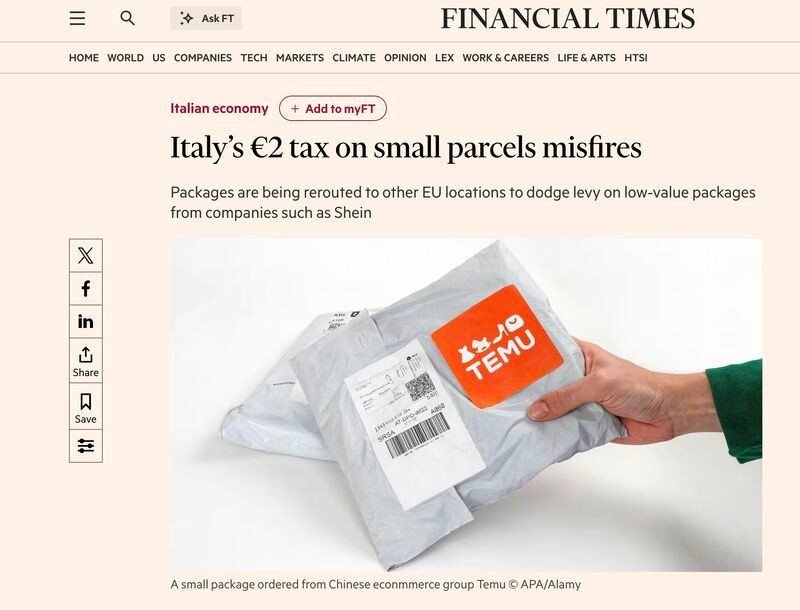 The government slaps a ā¬2 charge on sub-ā¬150 parcels (hello, Shein/Temu), forecasts a nice, tidy ā¬122m this year, and then watches as the parcels do what parcels do in a single market: they route around the obstacle with flights divert to LiĆØge/Amsterdam/Budapest, Italyās direct low-value arrivals drop 36% in the first 20 days, and the logistics guys are like ...