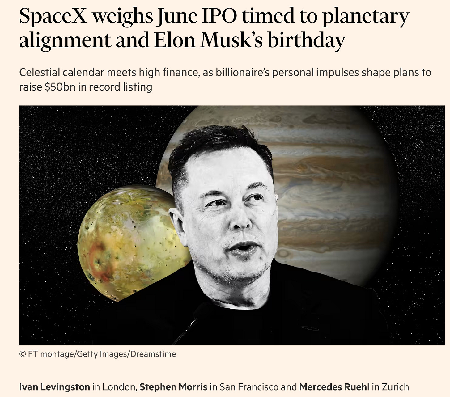 And thatās the core of the joke here. The listing is a spectacle designed by the man who sent a Tesla Roadster into orbit and tweeted āfunding securedā at $420. But it might work, because Musk has built companies that operate outside traditional gravity, both physical and financial. If you believe the future runs on rockets, bandwidth, and AGI, then SpaceX is no longer just a space company, but a vertical integration of the 21st century. The planets may be aligning in June, but so are the incentives. Happy birthday, Elon. Hereās your $50 billion presentļæ¼. You are trillionaire now! FT