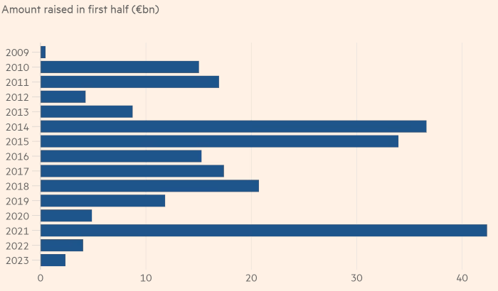 Just 34 companies were publicly listed in Europe in the first semester of 2023 raining EUR 2.4 billion (-42% YoY). LINK